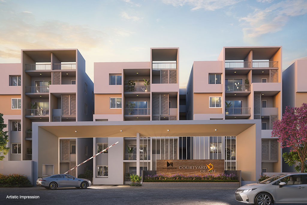 Courtyard of Life by Navanaami offers thoughtfully crafted 3 BHK luxury flats for sale in Bengaluru, located on Sarjapur Road near Kodathi Village. Spread over 2.39 acres with 66% open space and units ranging from 1663-1759 sq. ft., the project blends Vaastu-compliant design with modern architecture. Residents enjoy a serene lifestyle amidst green surroundings and a lavish clubhouse featuring amenities for all age groups. The central courtyard acts as the social heart of the community. Its strategic location offers seamless connectivity to Wipro IT Park, Accenture, and leading schools, with the upcoming metro further enhancing accessibility. Ideal for families and young professionals, Courtyard of Life ensures a perfect balance of work, leisure, and nature.